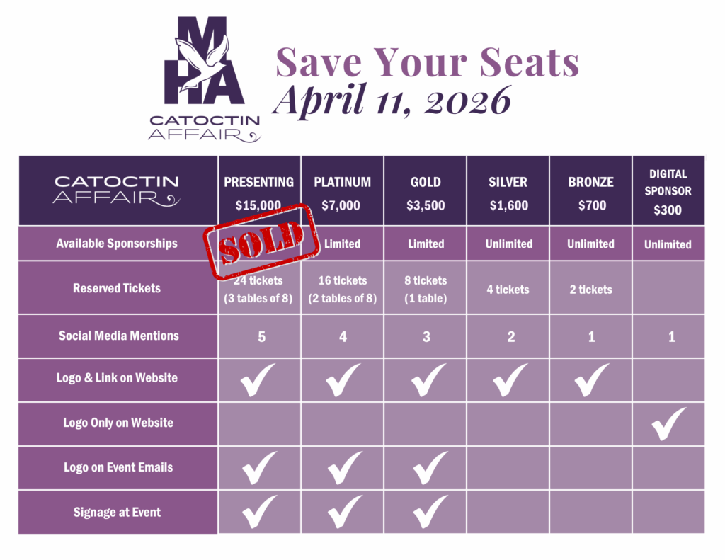 We are honored to recognize the 2025 Catoctin Affair sponsors who generously support MHA’s critical programs and services – thank you! Proceeds from the event support MHA’s vital programs and resources to care for the emotional and mental well-being of our community. We are grateful for the many sponsors who have contributed to the success of the Catoctin Affair for the past 26 years.